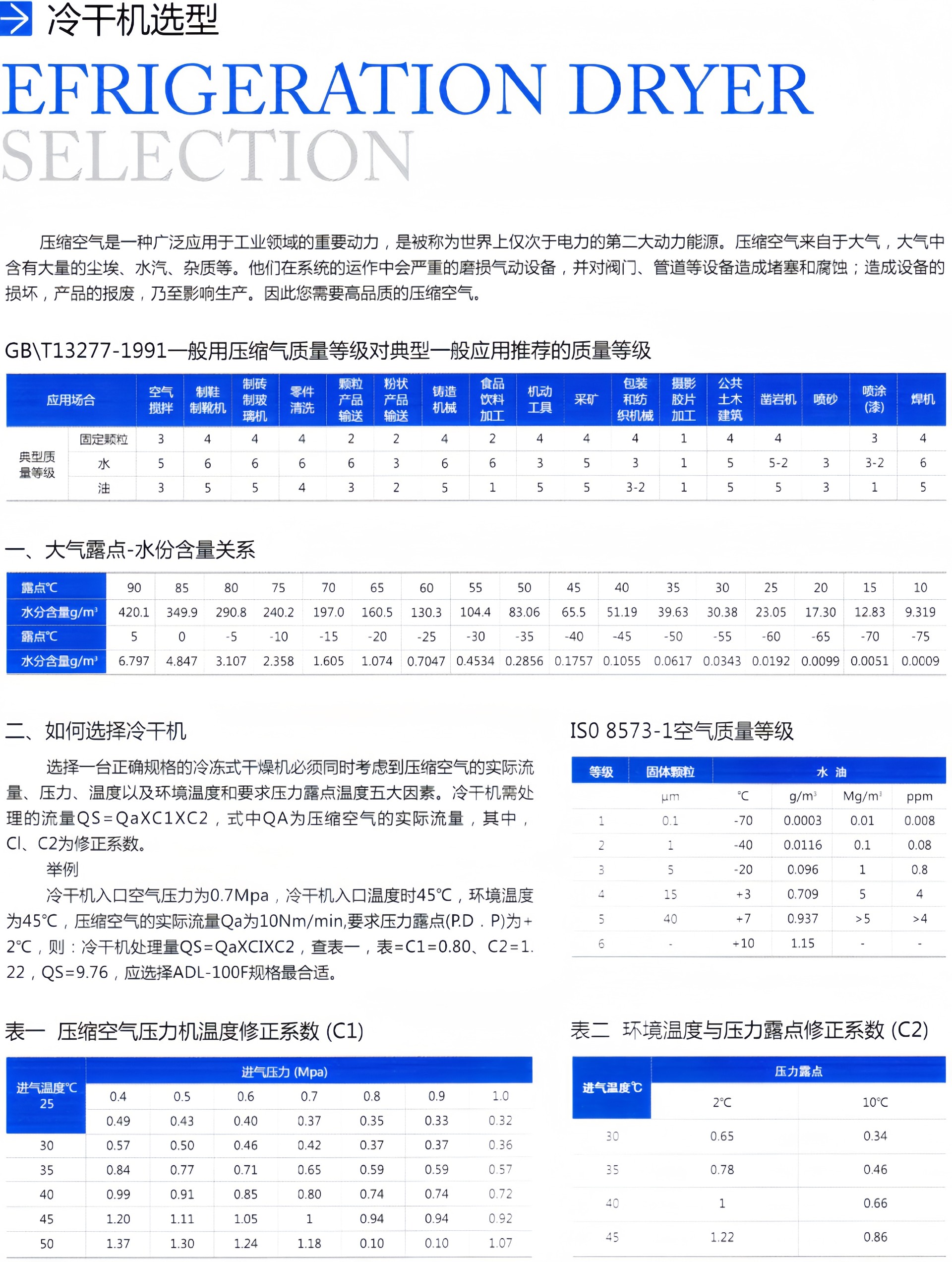 产品描述:工况条件与技术指标进气温度(Inlettemperature)≤45℃冷却温度(Coolingmethod):风冷(Air-cooling)进气压力(Inletpressure):0.6~1.0Mpa压力损失(Pressuredrop):≤0.02Mpa压力露点(Dewpoint):2~10℃制···